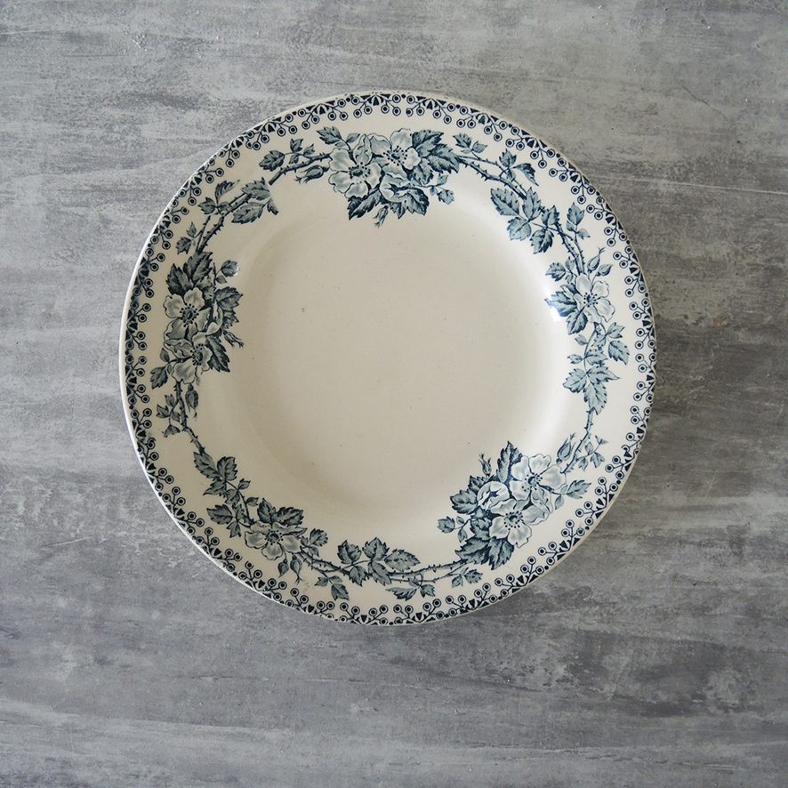 Ces pièces authentiques, au charme intemporel, sont de la collection GUADELOUPE : une frise florale bleu sur fond blanc.