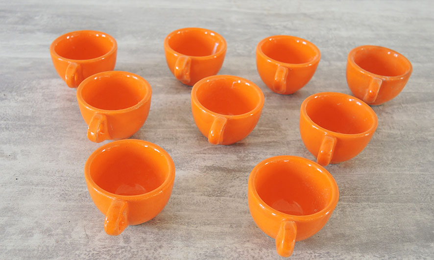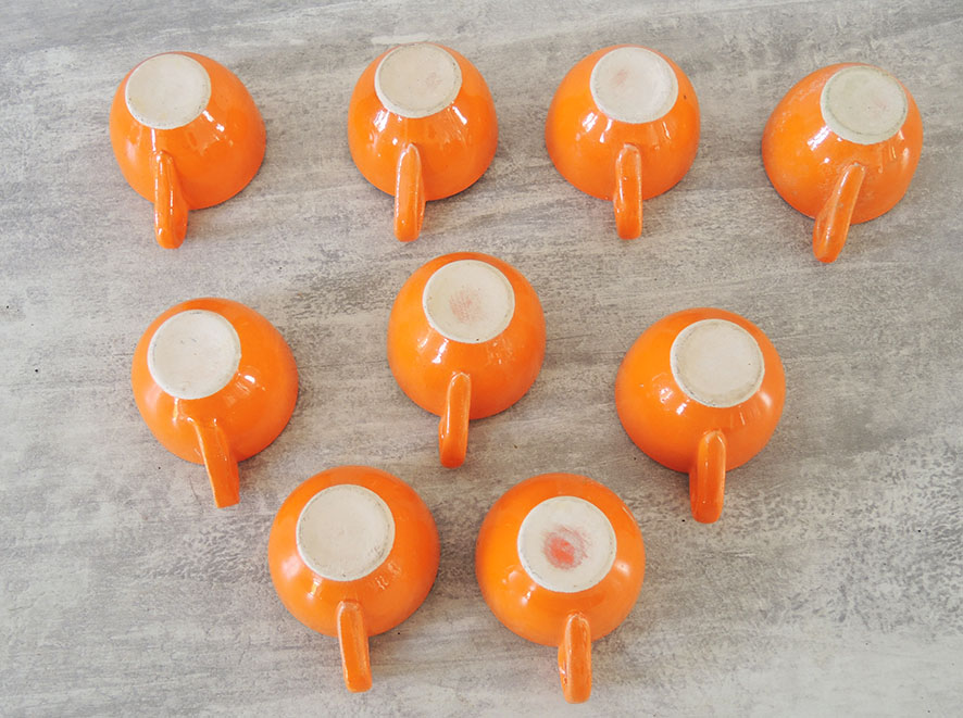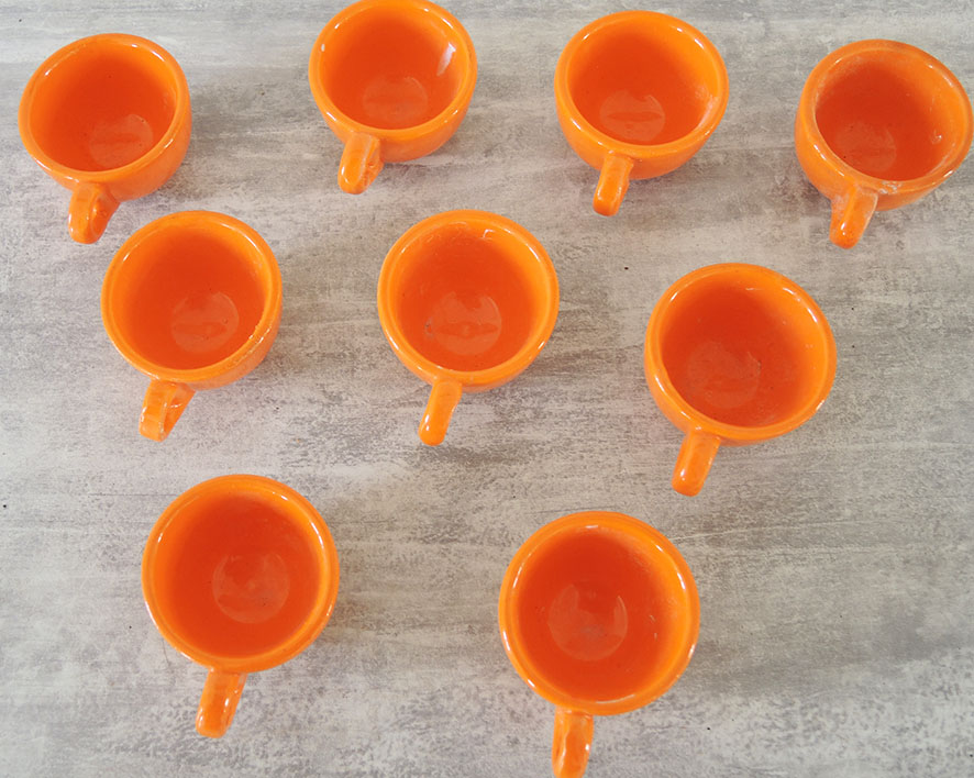 Superbe assortiment de tasses à calvados – digestif – alcool vintage en faïence orange.