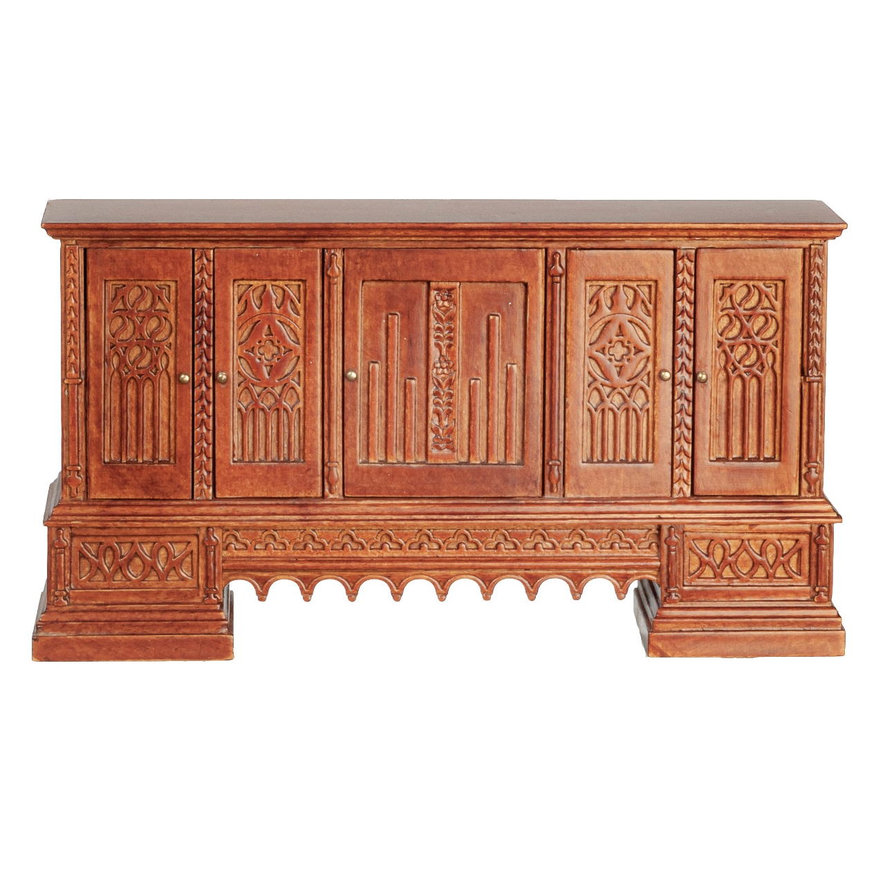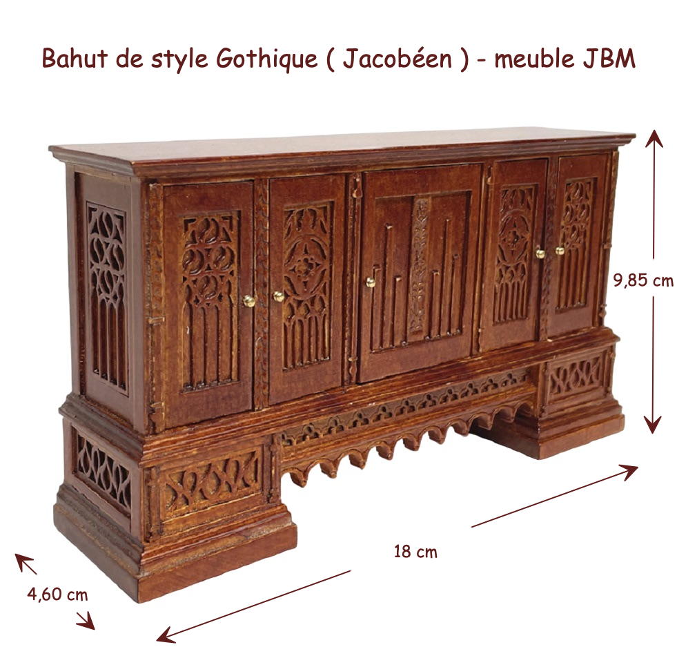 Un peu d’histoire : Le style gothique, apparu au XIIe siècle en France, a marqué l’architecture et les arts décoratifs européens. Connu pour ses motifs sculptés et ses structures élancées, ce style a été utilisé pour sublimer les églises et les cathédrales. Ce bahut s’inspire de cette tradition gothique, apportant l’essence de cette époque au sein de votre maison de poupée.