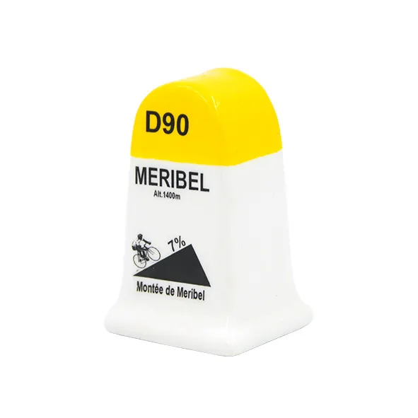 Borne kilométrique en céramique, réplique des bornes de la montée du Col de la Loze à Méribel. Sur la réplique se trouve le pourcentage de la pente ainsi qu’un vélo de route.