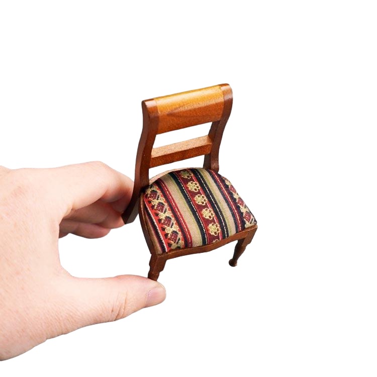 Cette chaise miniature est fabriquée en bois massif, en outre, elle est robuste et raffinée, ainsi son assise est rembourrée avec un tissu rayé qui apporte du caractère, de plus, son design classique s’intègre facilement dans différents décors miniatures.