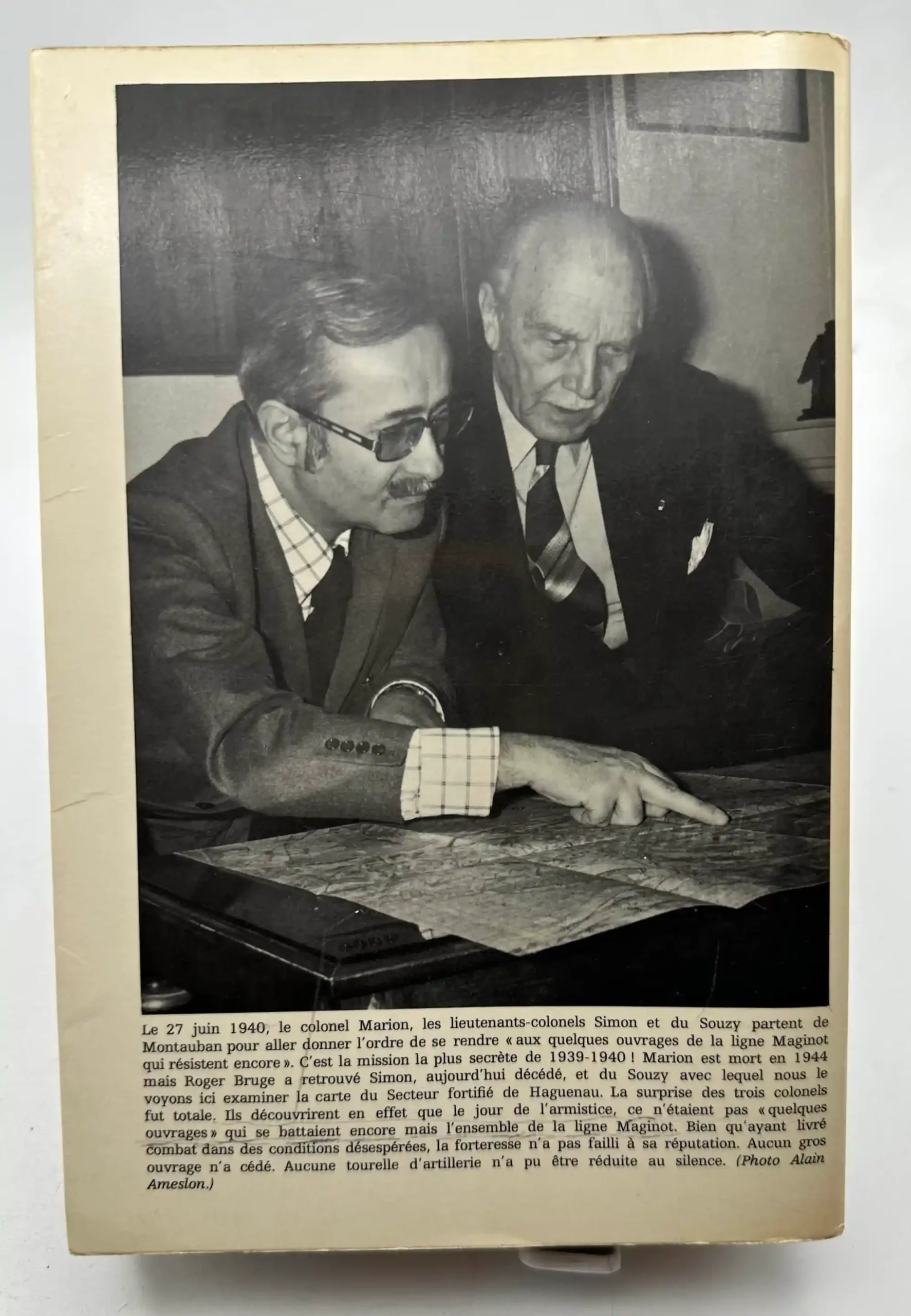 Le 27 juin 1940, le colonel Marion, les lieutenants-colonels Simon et du Souzy partent de Montauban pour aller donner l’ordre de se rendre » aux quelques ouvrages de la ligne Maginot qui résistent encore « . C’est la mission la plus secrète de 1939-1940! Marion est mort en 1944 mais Roger Bruge a retrouvé Simon, aujourd’hui décédé, et du Souzy avec lequel nous le voyons ici examiner la carte du Secteur fortifié de Haguenau. La surprise des trois colonels fut totale. Ils découvrirent en effet que le jour de l’armistice, ce n’étaient pas » quelques ouvrages » qui se battaient encore mais l’ensemble de la ligne Maginot. Bien qu’ayant livré combat dans des conditions désespérées, la forteresse n’a pas failli à sa réputation. Aucun gros ouvrage n’a cédé. Aucune tourelle d’artillerie n’a pu être réduite au silence.