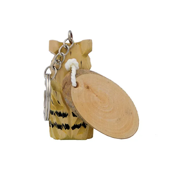 Porte-clés représentant un hibou en bois sculpté et peint.