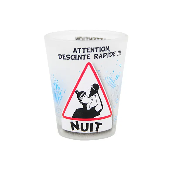 Verre à Liqueur « Attention Descente Rapide ». Une face jour et une face nuit.