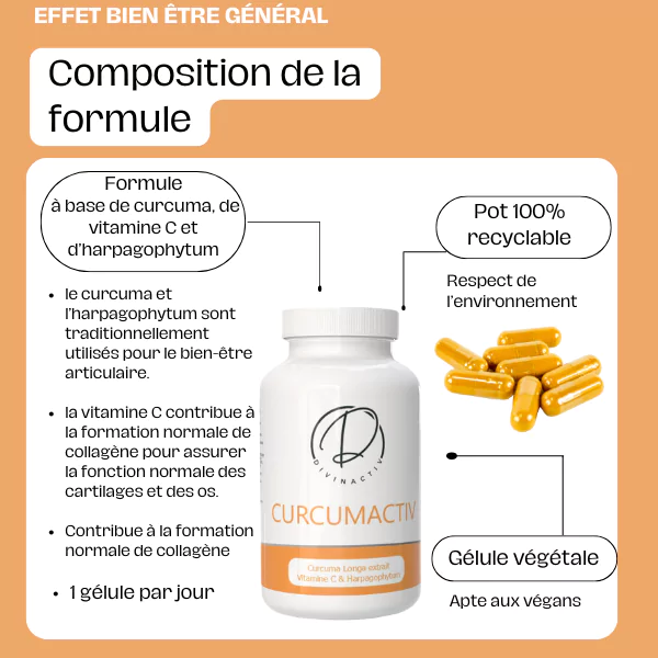 Confort articulaire : le curcuma et l’harpagophytum sont traditionnellement utilisés pour le bien-être articulaire.